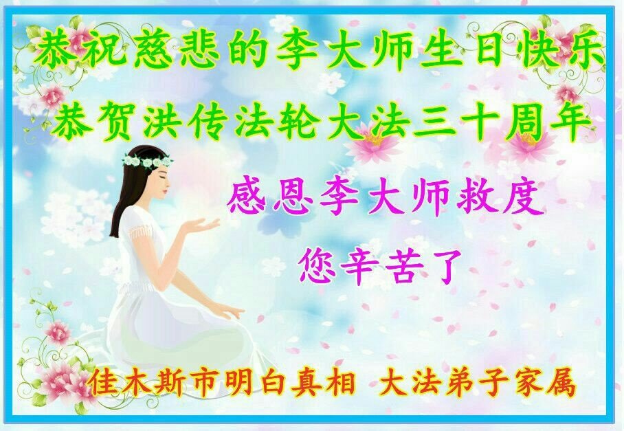 法轮大法洪传世界,亿万大法弟子在大法中身心受益。今年是法轮大法洪传世界三十周年,五月十三日是世界法轮大法日,也是慈悲伟大师父的华诞!在这普天同庆的大好日子里,我们大法弟子及家属感谢师父慈悲救度,感谢师父对大法弟子及家属的慈悲保护。 河北省廊坊市三燕郊大法弟子及家人敬上 河北省廊坊市三河市一名大法弟子家属祝李大师生日快乐!
