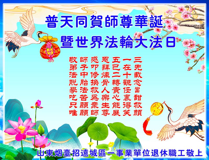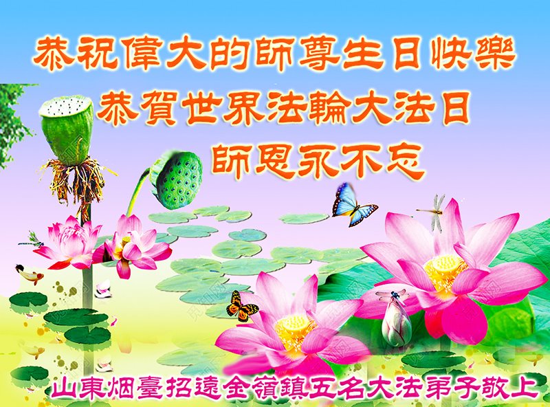 在五·一三世界法轮大法日即将到来之际,也是伟大的师尊华诞之日,我们学法小组的六位大法弟子向慈悲伟大的师父致以节日的问候:恭祝师父生日快乐! 山东烟台市招远市一学法小组大法弟子敬上 山东烟台招远城区一事业单位退休职工恭祝慈悲师父生日快乐!普天同贺世界法轮大法日!