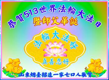 今年是世界法轮大法洪传三十周年,在师尊华诞和五·一三法轮大法日到来之际,在此真诚祝贺!感谢师父的慈悲保护弟子才走到了今天,谢谢师父!弟子以后会做好三件事,以谢师恩! 山东大法弟子敬上 山东省烟台市龙口市一大法弟子家人敬贺法轮大法日!