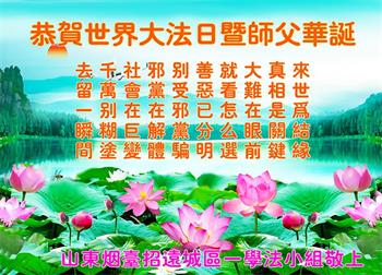 弟子合十叩拜! 山东淄博大法弟子恭贺法轮大法日暨师尊华诞!