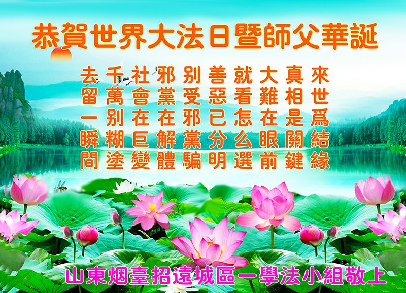 我们全家人能幸运的来到世上,闻听了万古难遇的高德大法。大法洪传三十年来,我们也都亲眼见证了大法的超常和神圣,对大法和大法师父无限的感恩!真诚的谢谢慈悲伟大的师父!感谢师父将这么好的大法在末法末劫时洪传人类,救度已处于毁灭中的可贵的生命。 山东烟台招远城区一学法小组大法弟子恭贺世界法轮大法日暨恭祝师父生日快乐!