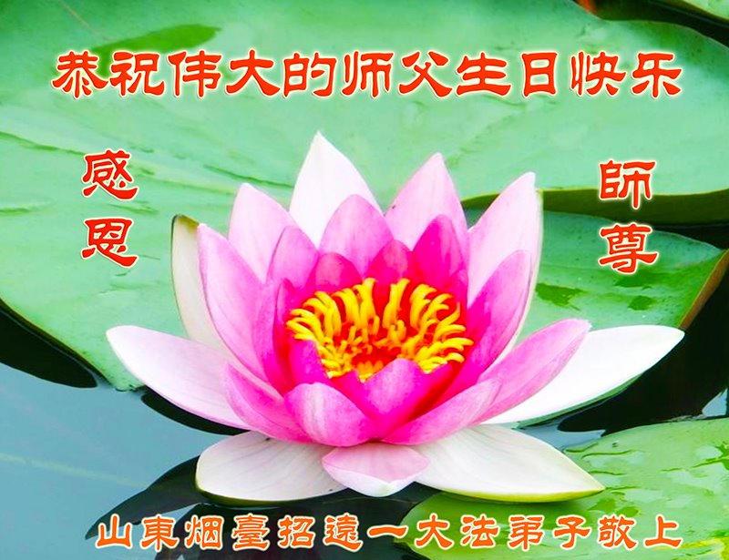 东营区一学法小组大法弟子向师父问好! 师父为了弟子修炼费了大量心血,真是千言万语也说不尽,师父看护着、保护着弟子,给弟子消除业力,承受业力,平衡着一切,师父给弟子做的真是太多太多了,弟子发自内心谢谢师父、谢谢师父!我们全体大法弟子在修炼的路上要勇猛精進,多学法、学好法,实修自己、放下执着,归正自己的一思一念,严格要求自己不放松,救度更多众生,兑现自己史前的誓约,圆满随师回家! 山东烟台市招远市大法弟子恭祝师父生日快乐!庆贺世界法轮大法日!