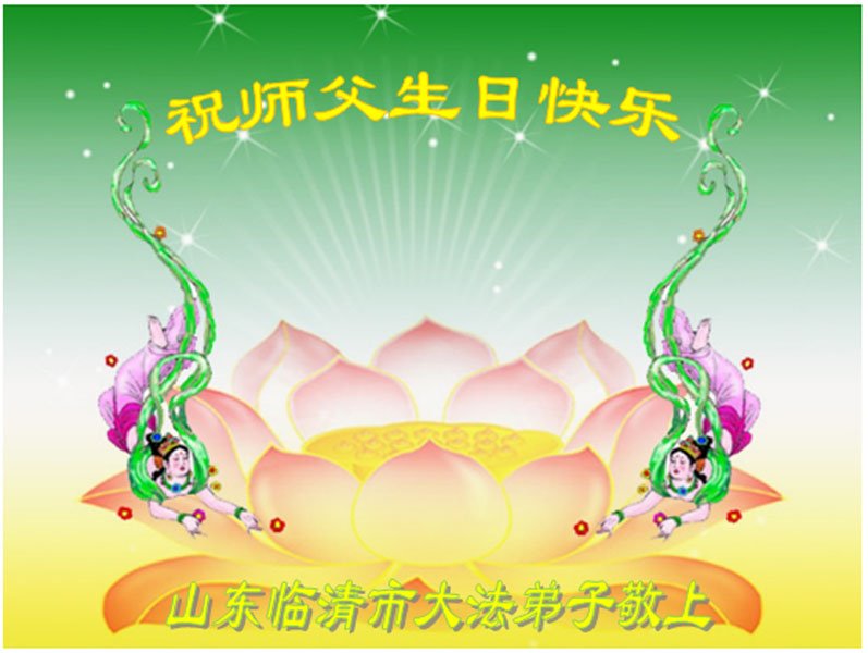 弟子们想念师父!弟子们一定精進实修,多学法,做好三件事,救度更多的众生,圆满随师还。 山东省聊城市临清市大法弟子恭祝师尊生日快乐!恭贺世界法轮大法日!