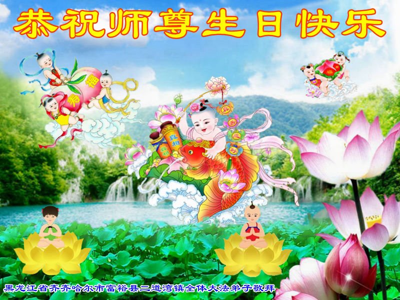 我们一定遵照师尊的教诲,做好三件事,不辜负师尊的慈悲救度! 黑龙江省齐齐哈尔市富裕县二道湾镇全体大法弟子恭祝师尊生日快乐!庆贺世界法轮大法日!