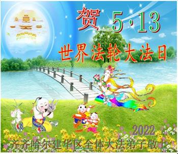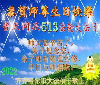 【明慧网二零二二年五月十二日】 黑龙江省齐齐哈尔市昂昂溪区全体大法弟子恭祝师尊生日快乐!恭贺世界法轮大法日!