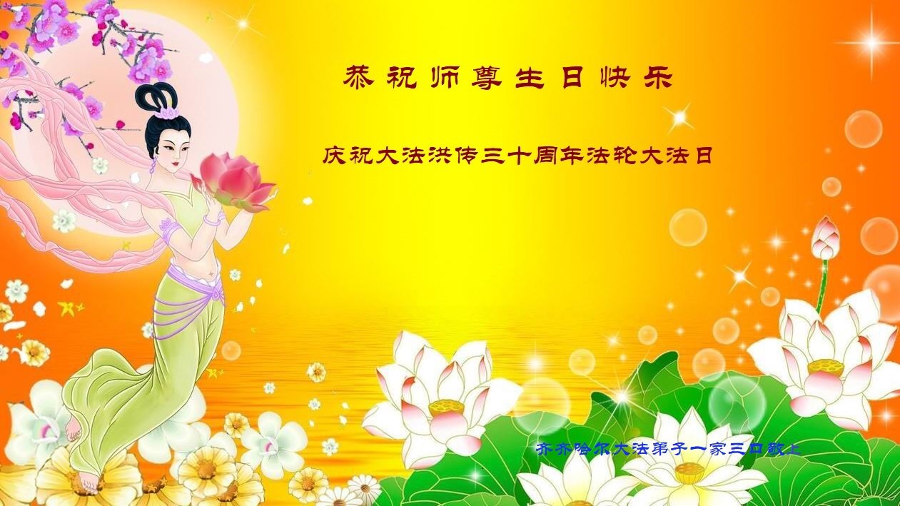 齐齐哈尔全家大法弟子恭祝恩师生日快乐!全家得此宝书感恩师尊!叩拜师恩! 黑龙江齐齐哈尔甘南县全体大法弟子恭祝师尊生日快乐!恭贺世界法轮大法日!