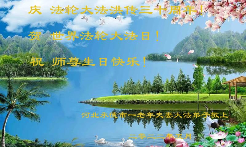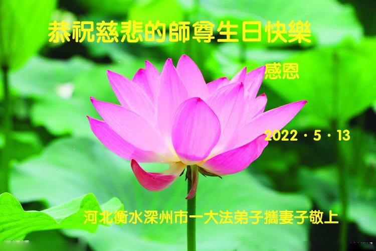 河北承德市一老年夫妻大法弟子恭祝慈悲伟大的师尊生日快乐! 大法洪传三十周年,救度世人于危难中。感恩师尊的精心保护,助弟子走过一个又一个劫难,弟子不忘初心,牢记使命,无论修炼的路上有多少艰难险阻,也会义无反顾的跟随师尊走到底。 2022年5月7日 河北省衡水市深州市一大法弟子携妻子恭祝世界法轮大法日!
