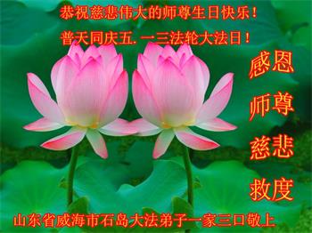 山东省威海石岛一家三位大法弟子恭祝慈悲伟大的师尊生日快乐!普天同庆世界法轮大法日!