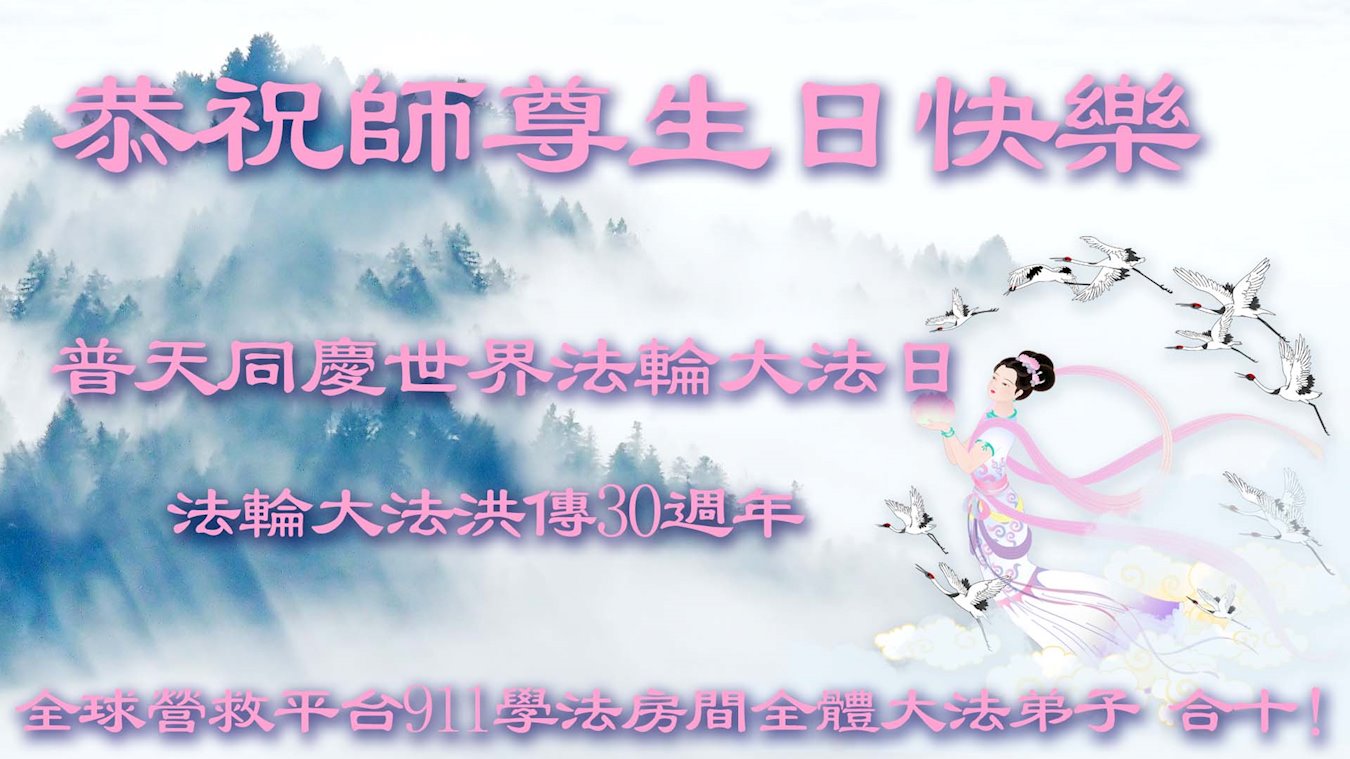 弟子们感恩师尊洪传大法、慈悲救度!弟子们会坚修大法、同化大法,听师父的话,做好三件事,援助大陆大法弟子主体,救度主流社会的众生,走正随师正法回家的路,圆满功成。910全体大法弟子叩谢师恩! 全球营救平台全体大法弟子恭祝师尊生日快乐!恭贺世界法轮大法日暨大法洪传三十周年!