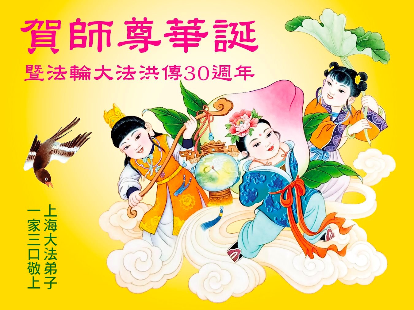 恭祝师尊华诞! 恭贺法轮大法洪传三十周年 感恩师尊慈悲救度保护无限 真善忍好法轮大法好九字真言 救众生出苦海躲避劫难 师尊救大穹建新宇力挽狂澜 除邪灵灭烂鬼法力无边 大法弟子助师正法坚定如盘 回归传统远离邪恶真相广传 学好法多救人神圣使命担在肩 兑现誓约不负众望珍惜万古机缘 来到海外的上海大法弟子一家三口恭祝师尊生日快乐!