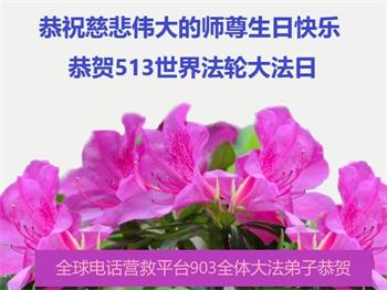 感恩师尊多年的慈悲保护与点化,值此大法洪传30周年之际,恭祝师尊生日快乐! 上海大法弟子一家三口敬上 2022年5月3日 全球电话营救平台903全体大法弟子恭祝师尊生日快乐!恭贺世界法轮大法日!