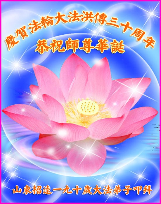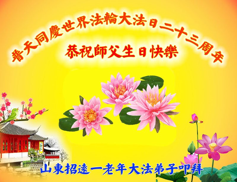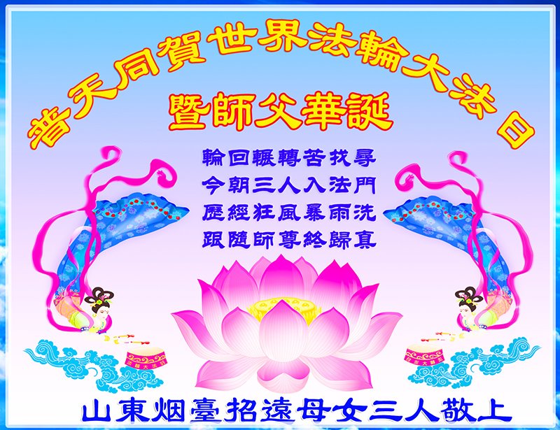 山东省烟台市招远市城区三名大法弟子及家人恭贺世界法轮大法日! 山东省烟台市招远市一老年退休大法弟子恭贺世界法轮大法日暨师尊华诞!
