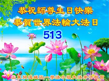 山东省泰安岱岳区十九名大法弟子祝贺世界法轮大法日! 山东省烟台市莱阳城区一学法小组的大法弟子恭祝师尊生日快乐!