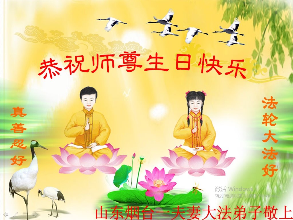 山东烟台一夫妻大法弟子恭祝师尊生日快乐!恭贺世界法轮大法日!
