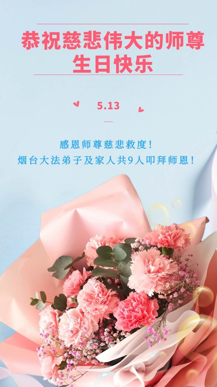 【明慧网二零二二年五月十三日】 山东烟台大法弟子及家人共9人恭祝慈悲伟大的师父生日快乐!