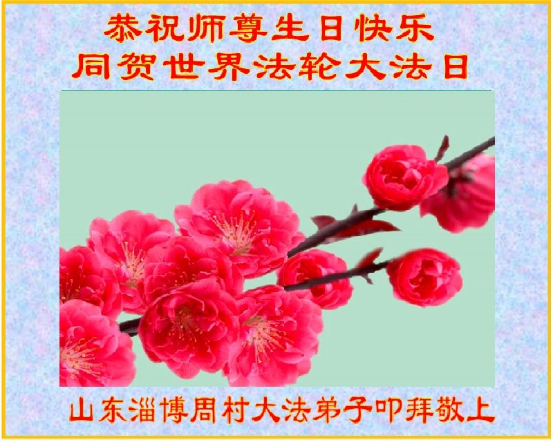 弟子1:祝愿伟大慈悲的师尊生日快乐!祝贺世界法轮大法日。在这伟大殊胜的时刻,弟子万分激动。洪大的正法進程到了尾声,弟子只有一颗心向师父表达:“抓紧时间做好三件事,去掉所有的执着,达到师父要求弟子达到的标准,圆满跟师父回家。” 弟子2:师父生日快乐!弟子要修好心性,天天出去讲真相。 弟子3:谢谢师父慈悲救度,祝师父生日快乐! 弟子4:恭祝慈悲伟大的师尊七十一华诞快乐!弟子以前总是叫师父操心,对不起!以后再也不了。谢谢师父慈悲苦度,在师父用巨大付出延续来的时间里,弟子一定严格要求自己,时刻向内找,提高心性、多学法、勤炼功、多发正念、多救人,兑现自己的誓约“助师正法,救度众生”。 山东淄博周村全体大法弟子恭贺法轮大法日!