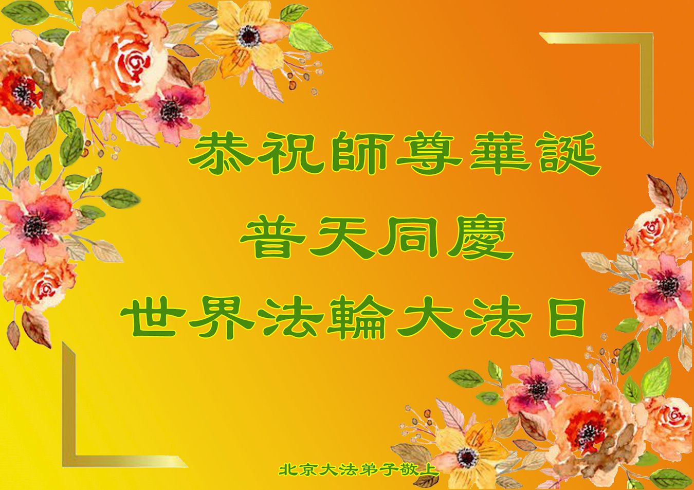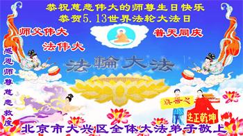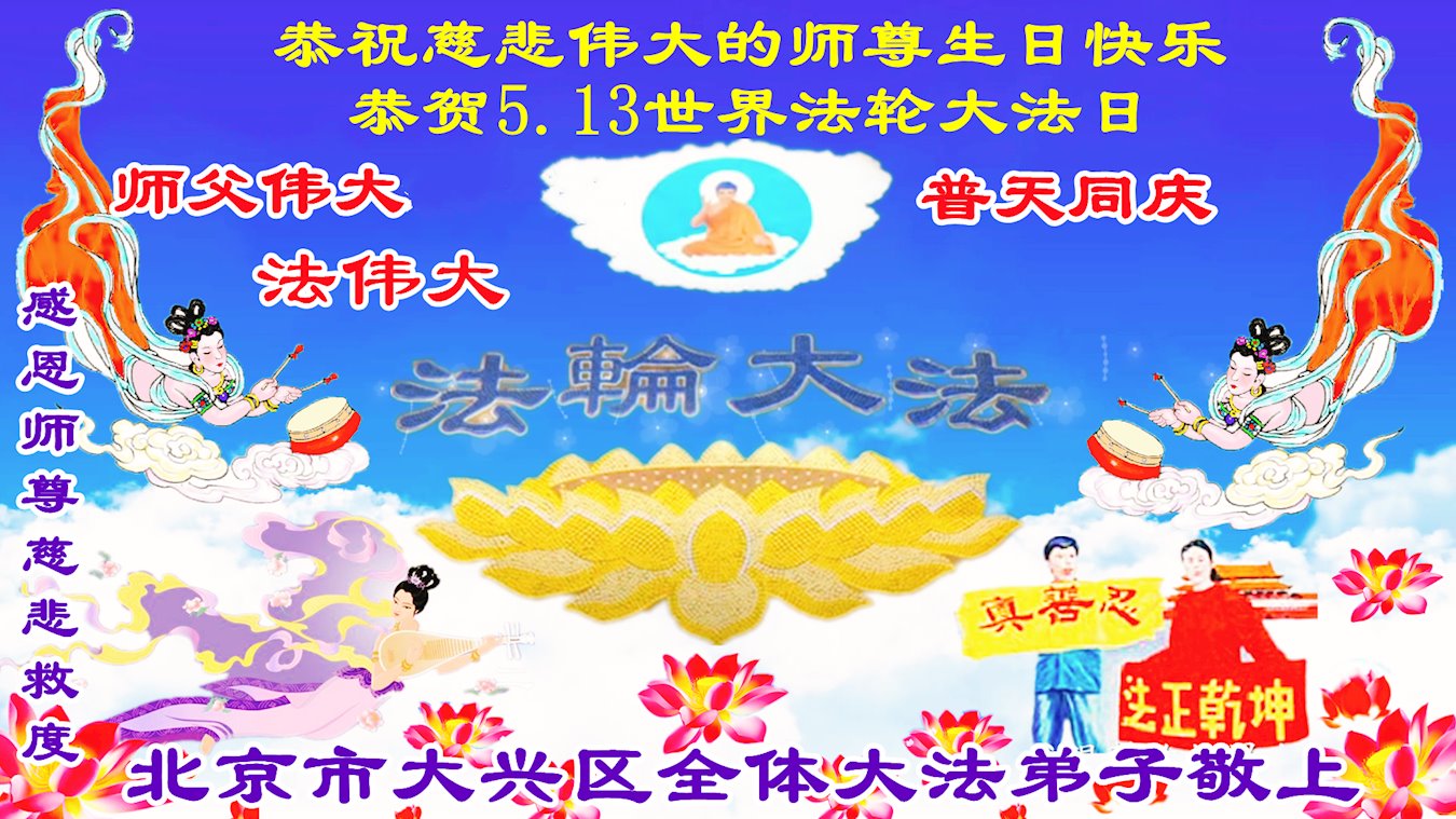 师尊洪传法轮大法救度众生,是众生之福!感恩师尊慈悲救度! 法轮大法好!真善忍好! 弟子一定做好三件事,圆满随师父回家! 北京市大兴区全体大法弟子恭祝慈悲伟大的师尊生日快乐!恭贺世界法轮大法日!