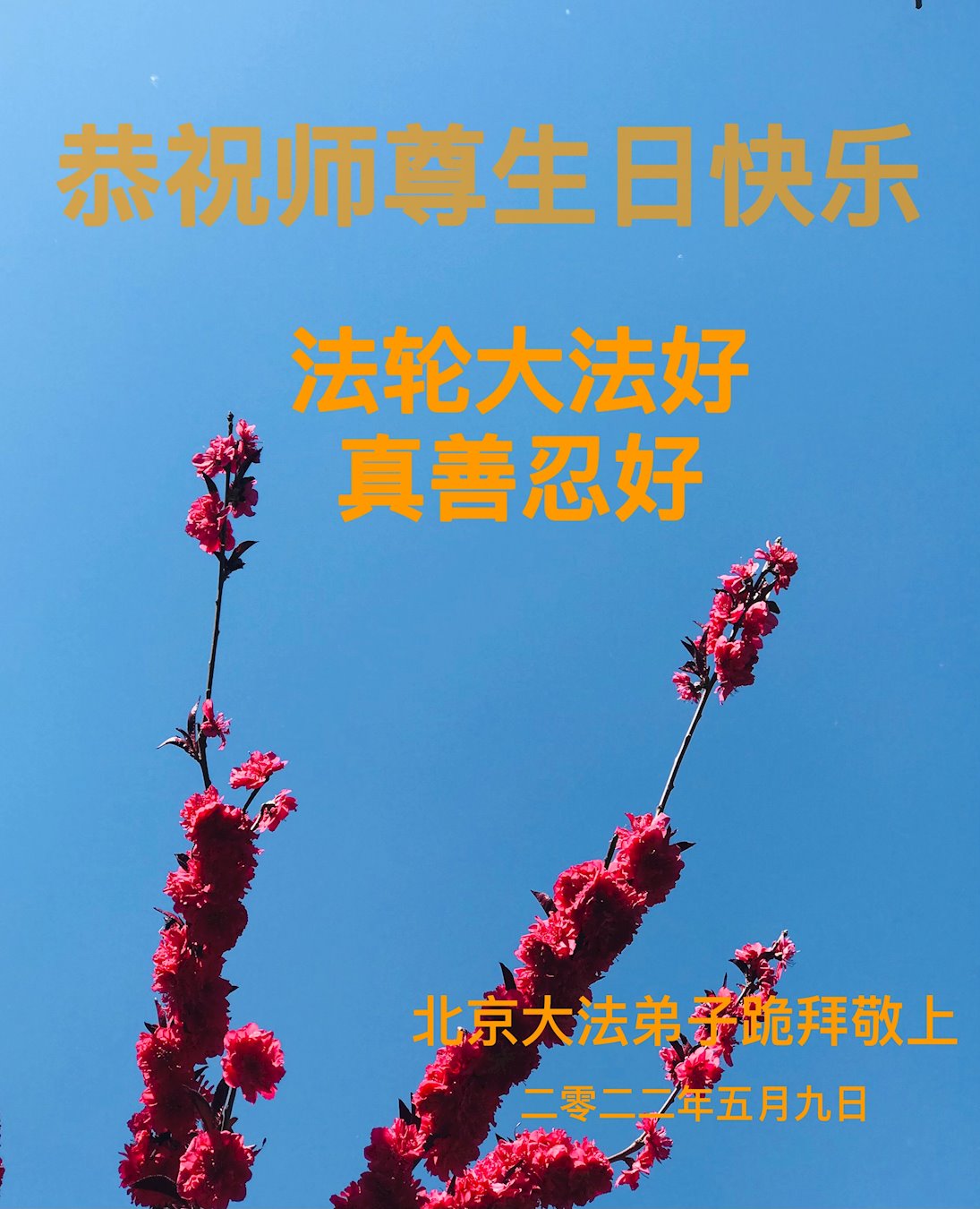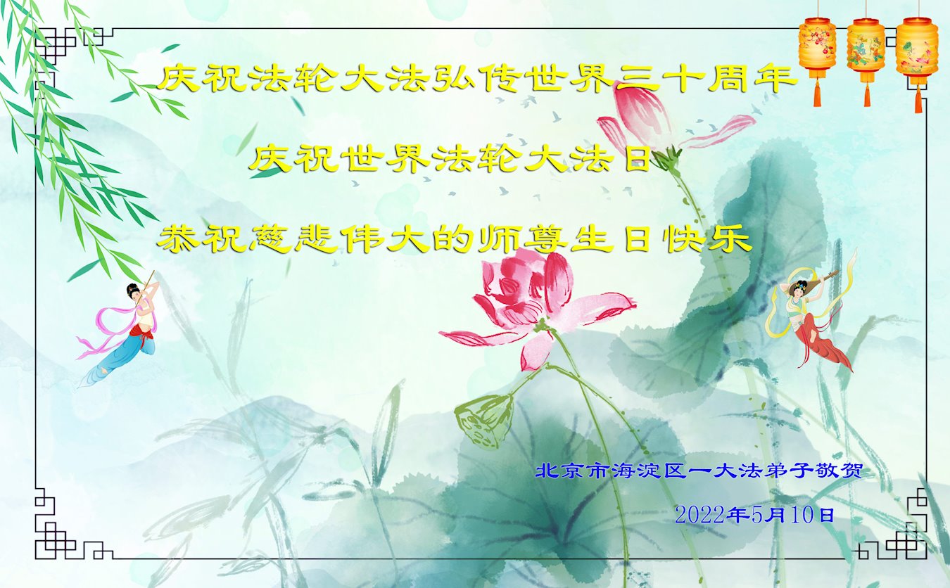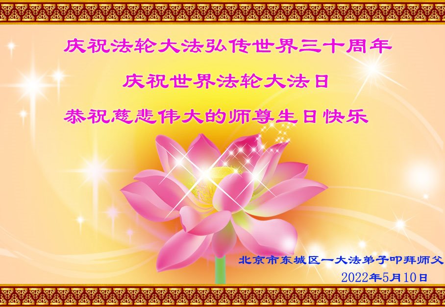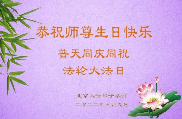 师尊您好!您辛苦了!感谢您的苦度之恩,恭祝您生日快乐! 二零二二年五月八日拜上 北京大法弟子恭祝师尊生日快乐!恭贺世界法轮大法日!