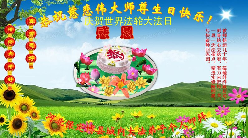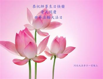 河北保定市大法弟子一家恭祝师父生日快乐!恭贺法轮大法日!