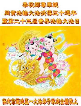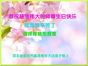河北保定大法弟子全家恭祝慈悲伟大的师尊生日快乐!庆贺法轮大法洪传三十周年!师父您好!我们一九九七年有幸得法,磕磕绊绊走到今天,感恩师父一路保护,师父您辛苦了!以后我们要多学法,努力做好三件事,跟师父回家,叩谢师恩! 河北省保定市蠡县青年大法弟子恭祝慈悲伟大的师尊生日快乐!恭贺世界法轮大法日!谢谢师尊慈悲救度!
