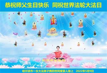 【明慧网二零二二年五月十三日】 黑龙江省哈尔滨一女大法弟子携四世同堂家人祝贺师父生日快乐!
