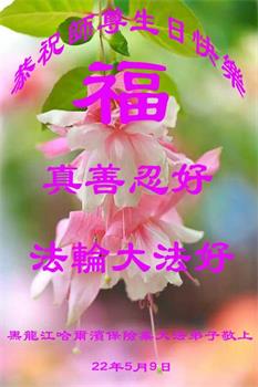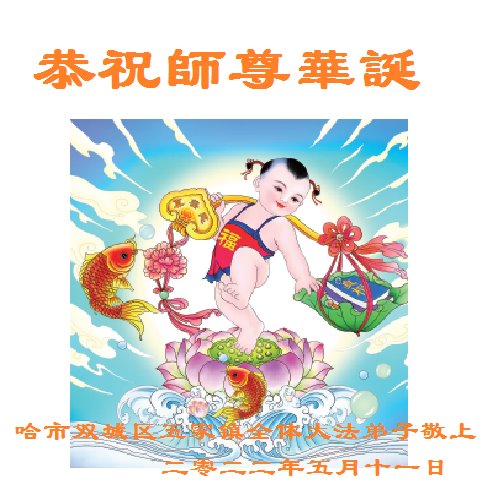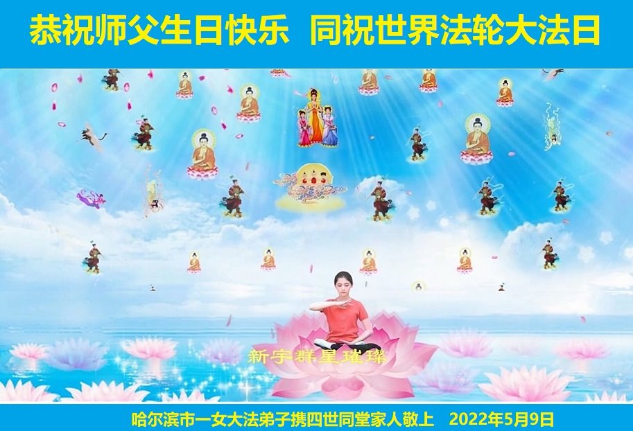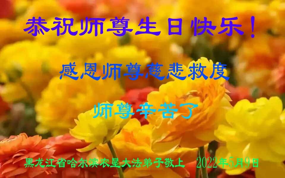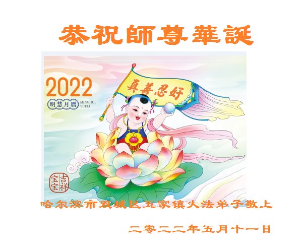 黑龙江哈尔滨市南岗区学府路一大法弟子学法组恭祝慈悲伟大的师尊生日快乐!弟子谢师恩!叩拜师尊! 2022年5月9日 黑龙江省哈尔滨大法弟子恭贺世界法轮大法日!