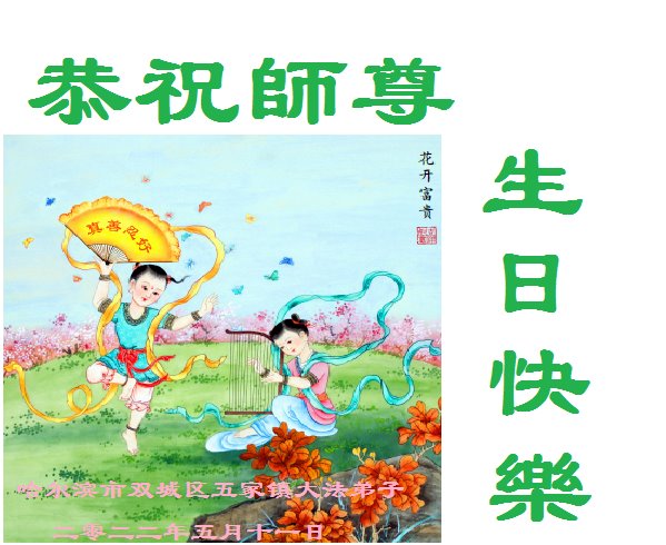 大法弟子祝李洪志师父生日快乐!恭贺法轮大法洪传三十周年! 助师正法,精進实修,做好三件事,兑现誓约,随师圆满回家。 黑龙江省哈尔滨市双城市区五家镇大法弟子恭祝师父生日快乐!