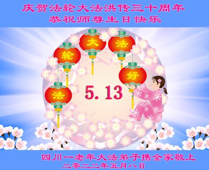 【明慧网二零二二年五月十三日】 四川一老年大法弟子携全家祝贺世界法轮大法日!恭祝师尊生日快乐!