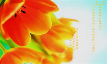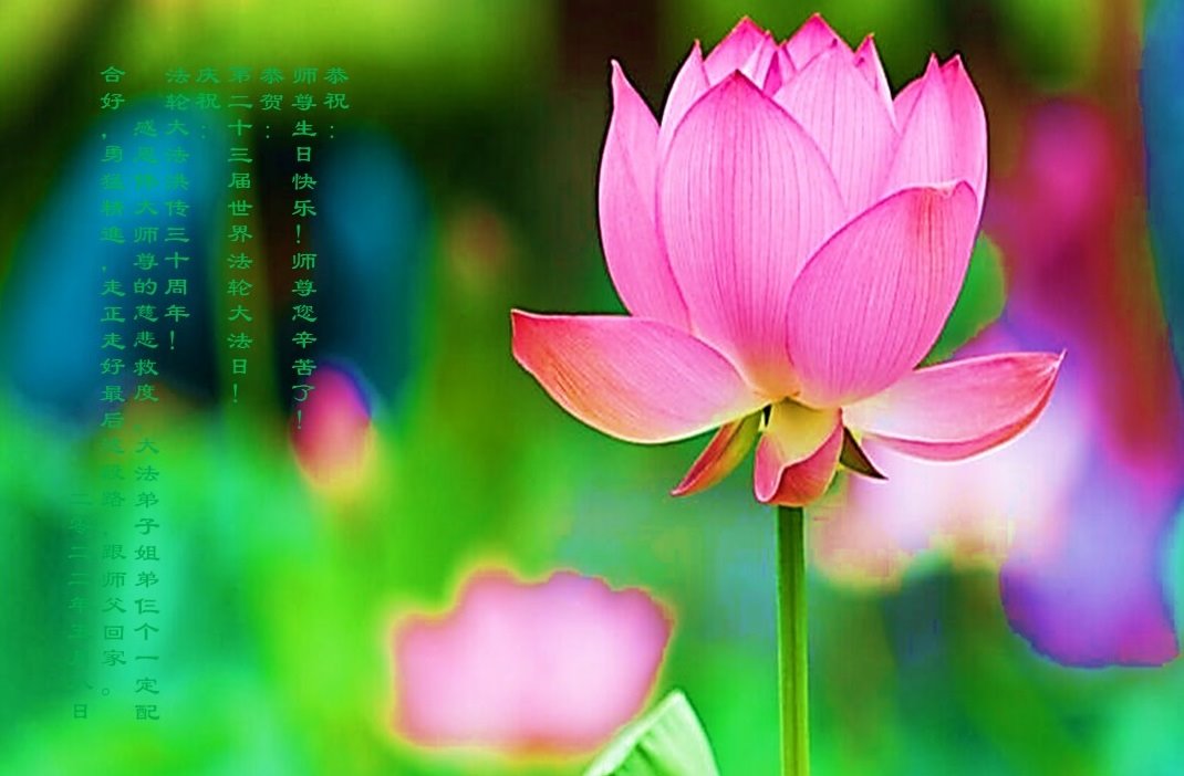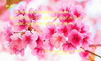 普天同庆法轮大法日及大法弘传三十周年! 一、祝师尊生日快乐! 叩谢师尊慈悲苦度,弟子一定要早日修去人心,多救人,修成新宇宙正觉,跟师父回家。法轮大法好!真善忍好! 二、恭祝师尊生日快乐!师尊您辛苦了! 谢谢师尊慈悲苦度,在这有限的时间里弟子要勇猛精進,去掉一切人心,救度众生,跟师父回家。 三、恭祝师尊生日快乐!普天同庆5.13法轮大法日及大法弘传三十周年! 感恩师尊的佛恩浩荡!弟子谢谢师尊对弟子的慈悲救度。在以后的日子里,弟子一定要正念正行,精進实修,做好三件事,跟师父回家。弟子惟愿师尊笑。 四、恭祝师尊生日快乐!师尊您辛苦了! 在这洪恩浩荡、普天同庆的日子里,惟愿师尊笑。在师尊加持下弟子一定修出纯真、纯善。胸怀大志,救度更多的众生。 五、祝师尊生日快乐!师尊辛苦了! 弟子愿在今后的修炼路上,多学法,学好法,完成好救度众生的使命,圆满跟师父回家。 河北省张家口大法弟子恭贺法轮大法日!