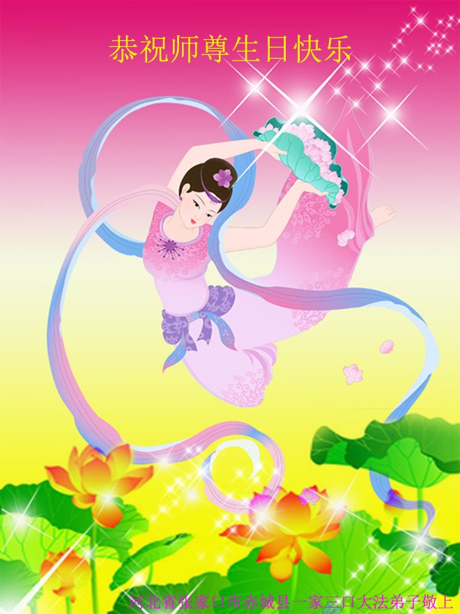 普天同祝同庆师尊的救度之恩!佛恩浩荡!叩拜师尊指引弟子走上返本归真之路!弟子兑现来世时用生命签下的誓约,提高心性,用智慧、理性的讲清真相,救度更多众生。 弟子再次叩拜师尊的救度之恩! 河北省张家口市赤城县一家三位大法弟子恭祝师父生日快乐!