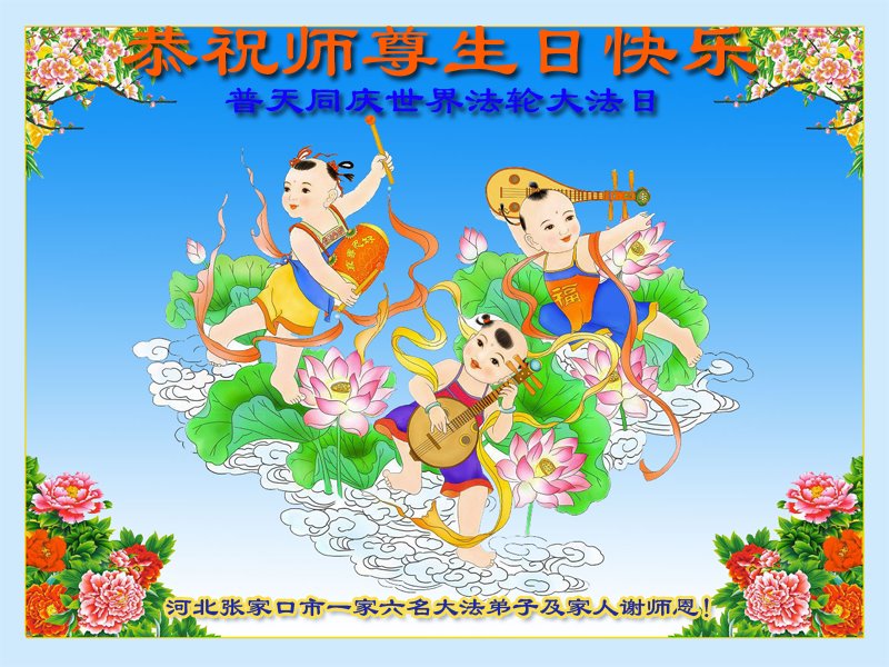 河北张家口地区蔚县城一女大法弟子携家人恭祝师尊生日快乐!