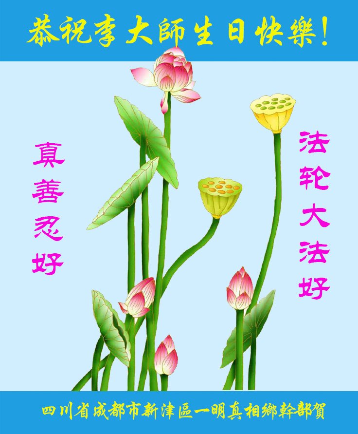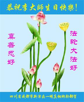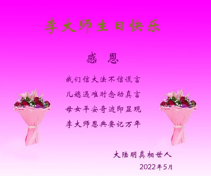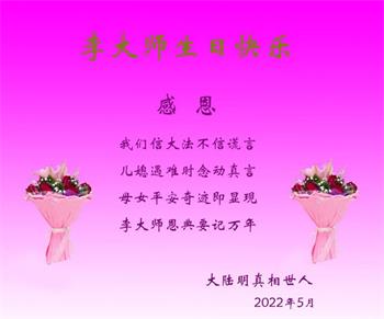 【明慧网二零二二年五月十三日】 四川省成都市新津区乡村一位八十多岁的退休干部恭祝李大师生日快乐!