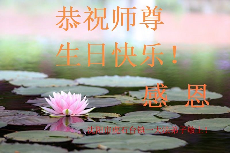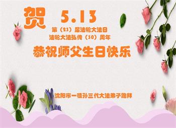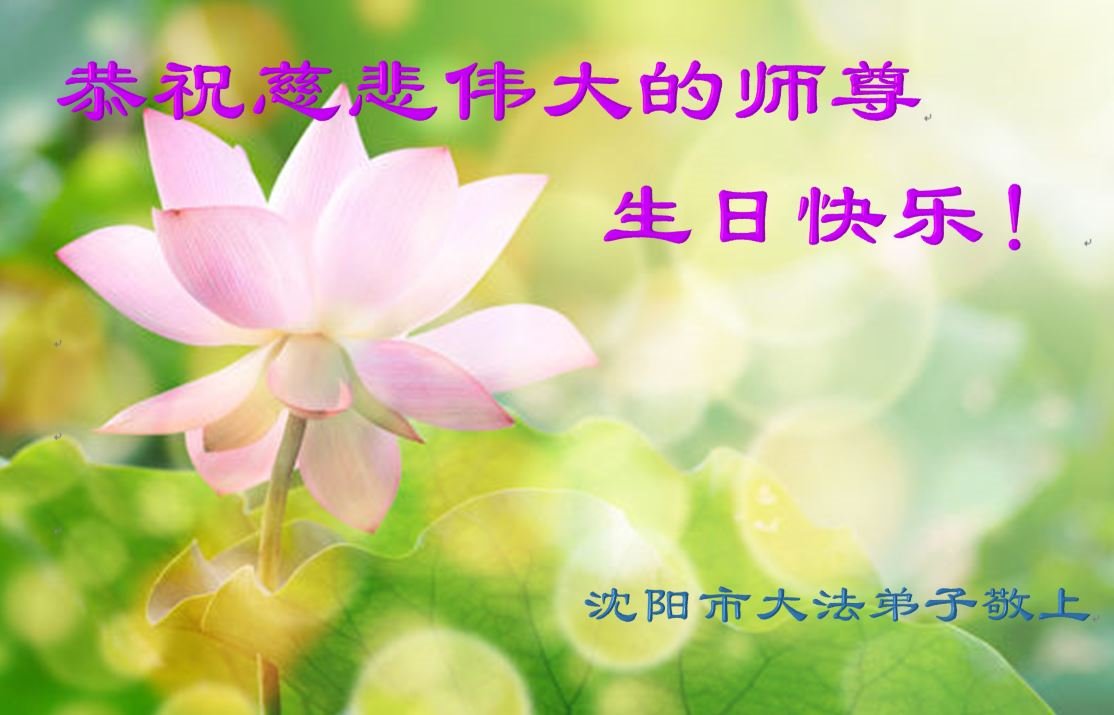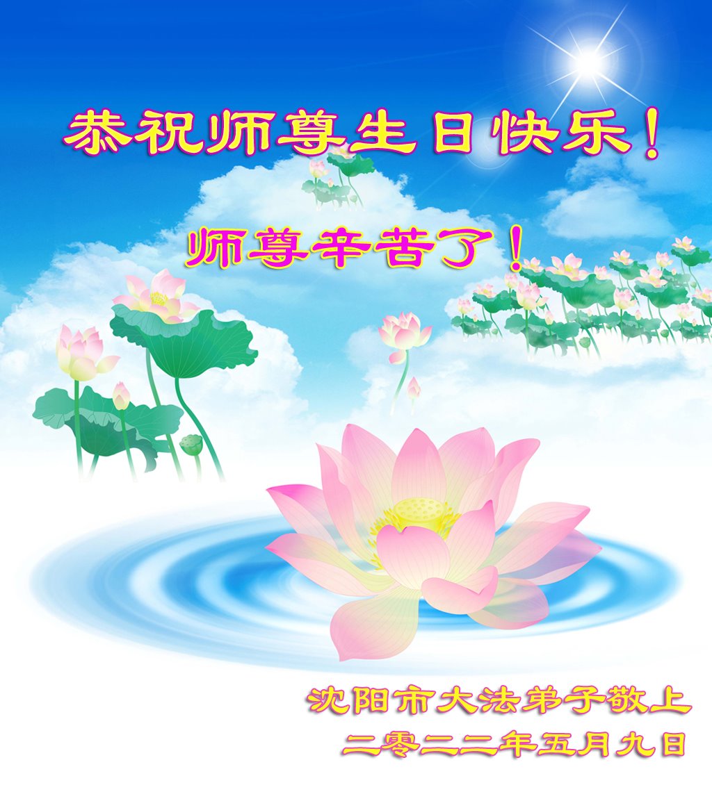 慈悲伟大的师尊好:叩拜师尊,恭祝师尊生日快乐!恭贺法轮大法洪传三十周年!沈阳弟子感恩师尊的慈悲救度与时时保护。沈阳弟子一定会越来越精進,修好自己,广传大法的福音,助师多救人。 法轮大法好!真善忍好! 沈阳市大法弟子敬上 辽宁省沈阳大法弟子代表家人恭祝师尊生日快乐!