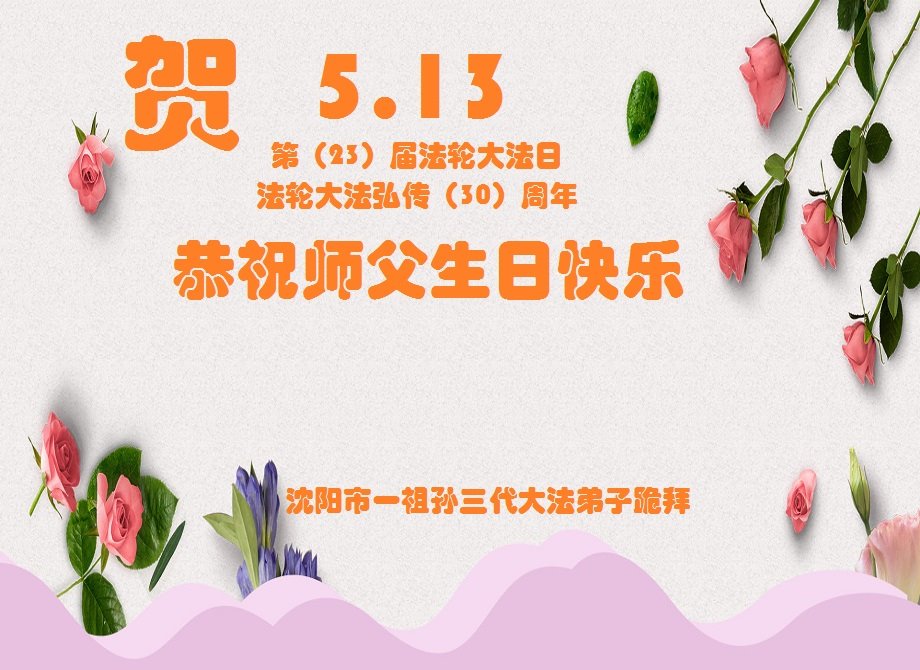 恭祝5.13世界法轮大法日暨师父生日快乐!感恩师父慈悲救度,在所剩不多的时间里,弟子希望能够更加精進,做好三件事,修好自己!感恩师父! 辽宁省沈阳市大东区一大法弟子恭祝师尊生日快乐!