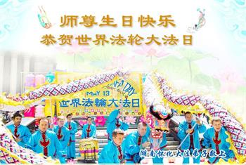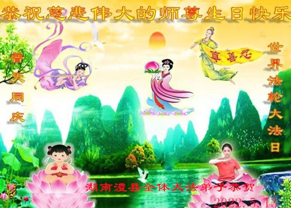 值此世界法轮大法日、法轮大法洪传三十周年、师尊华诞这普天同庆、震撼寰宇的最伟大而殊胜的日子里,大法弟子全家恭祝慈悲伟大的师尊生日快乐!感恩师尊慈悲救度!师尊辛苦了!弟子全家叩拜师尊! 湖南省邵阳市大法弟子敬贺法轮大法日!祝师父生日快乐!