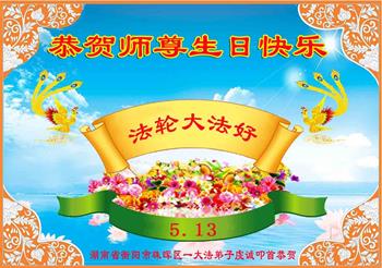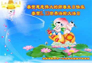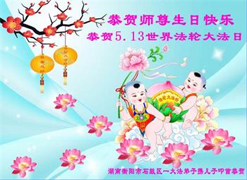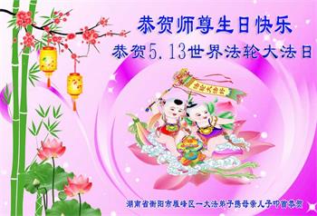 恭贺5.13世界法轮大法日 恭祝师尊生日快乐! 恭贺5.13世界法轮大法日! 湖南省衡阳市石鼓区一大法弟子携儿子叩首恭贺 湖南省岳阳地区汨罗市全体大法弟子敬贺法轮大法日!
