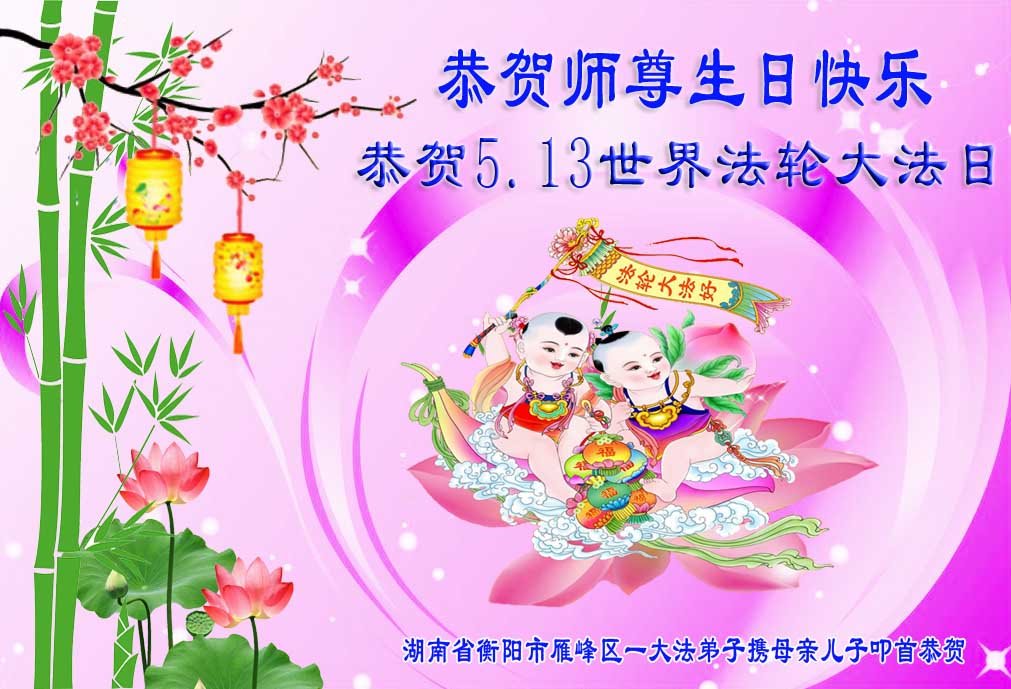 恭贺5.13世界法轮大法日! 恭祝师尊生日快乐! 恭贺5.13世界法轮大法日 湖南省衡阳市雁峰区一大法弟子携母亲儿子叩首恭贺 湖南省衡阳市雁峰区一大法弟子携家人叩首恭祝师尊生日快乐!恭贺世界法轮大法日!