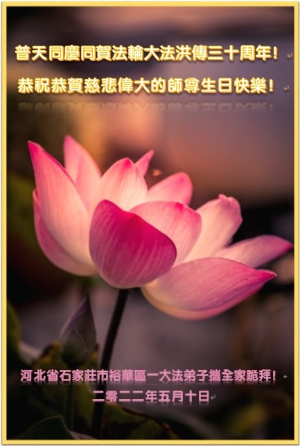师父辛苦了!能够作为一名大法弟子,倍感荣幸,在这正法的最后关键时期,做到遇事向内找,整体提高。抓紧时间做好三件事,不能忘记史前誓约,圆满随师还。 石家庄市赞皇县一大法弟子 二零二二年五月九日 河北省石家庄市裕华区夫妻大法弟子携儿子恭祝师尊生日快乐暨法轮大法日!
