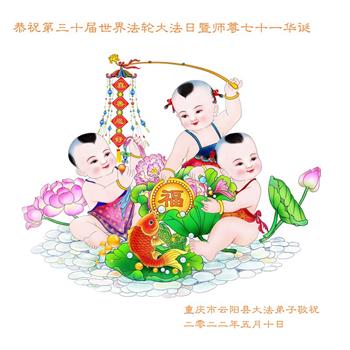 热烈庆祝法轮大法洪传三十周年!恭祝慈悲伟大的师尊七十一岁华诞!愿今年更進一步做好师父交给我们的三件事,做一个合格的大法弟子 2022年4月30日 重庆大足区全体大法弟子恭贺世界法轮大法日暨师尊华诞!