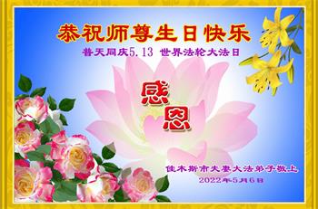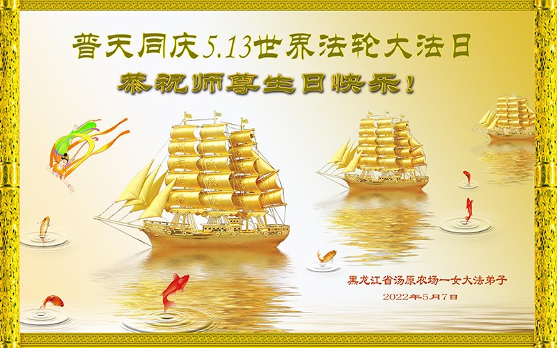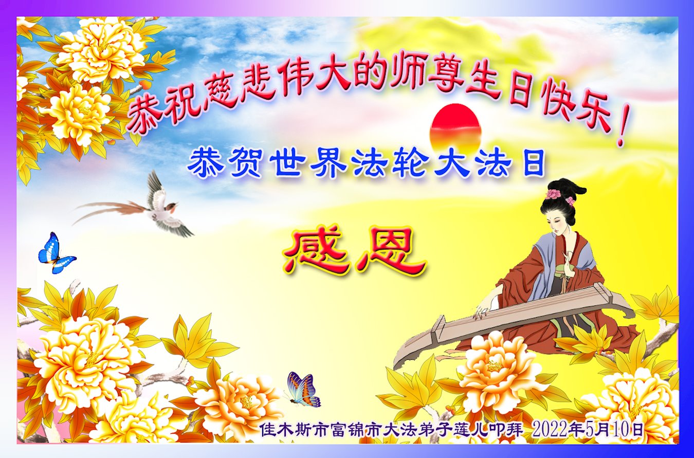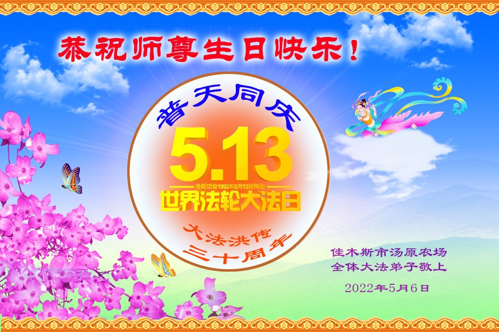 谢谢师尊慈悲苦度,弟子在今后修炼路上一定做好。 佳木斯郊区大法弟子代全家敬上 2022年5月6日 黑龙江省佳木斯市富锦市大法弟子恭祝师父生日快乐!恭贺世界法轮大法日!