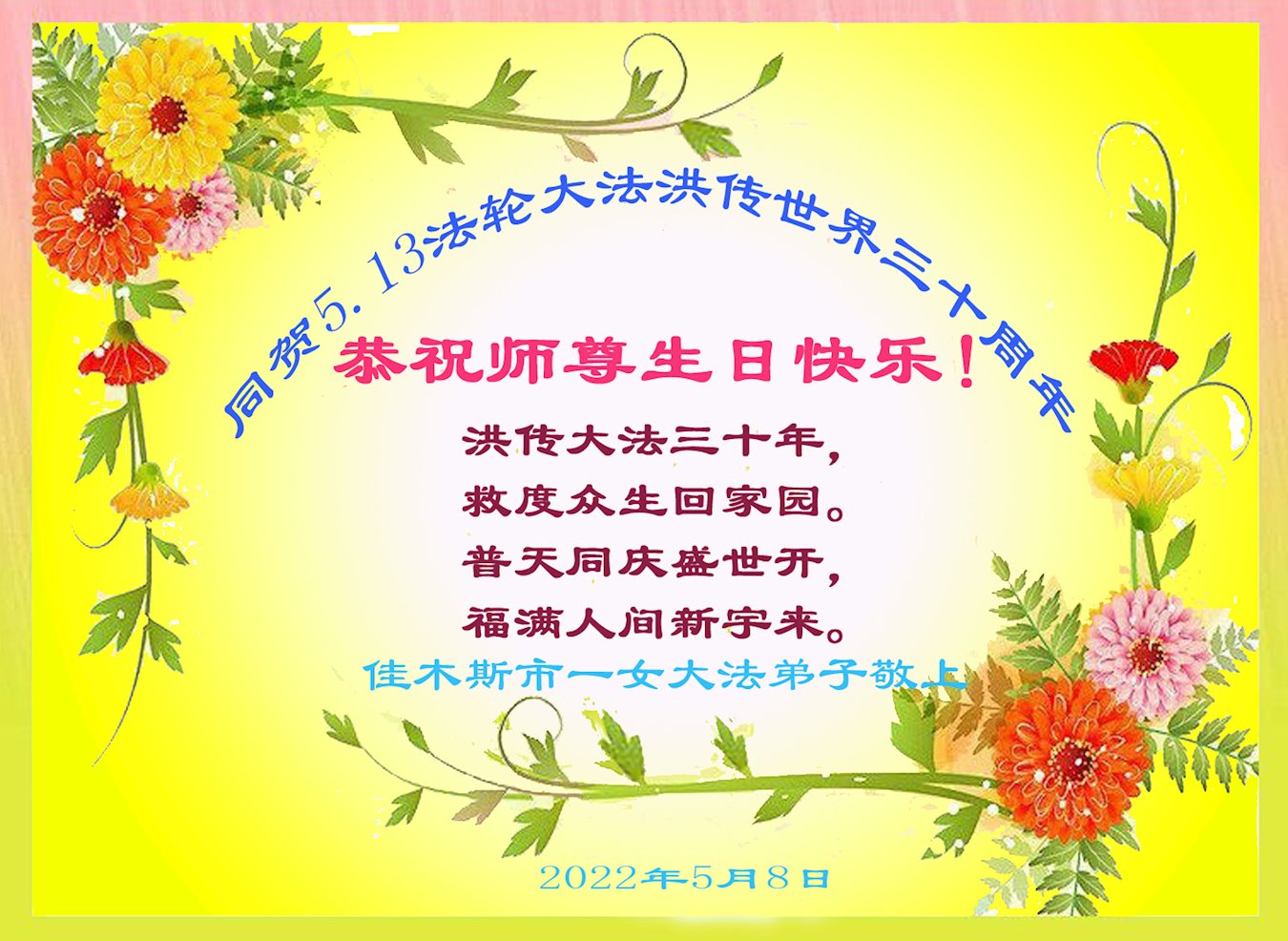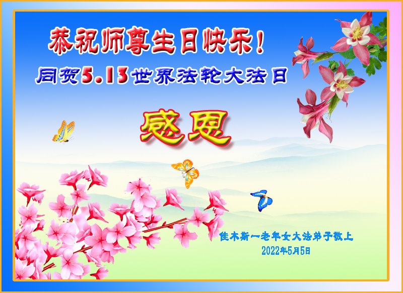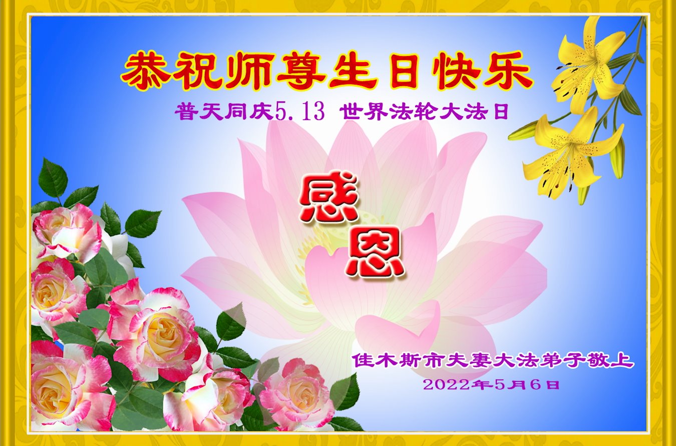 同庆世界法轮大法日,师尊传法三十周年,师尊辛苦了,感谢师尊对弟子每走一步的慈悲保护,谢师尊救度之恩,弟子学好法,修好自己多救众生, 佳木斯一老年女大法弟子敬上 2022年5月5日 黑龙江省佳木斯夫妻大法弟子恭祝慈悲伟大师尊生日快乐!