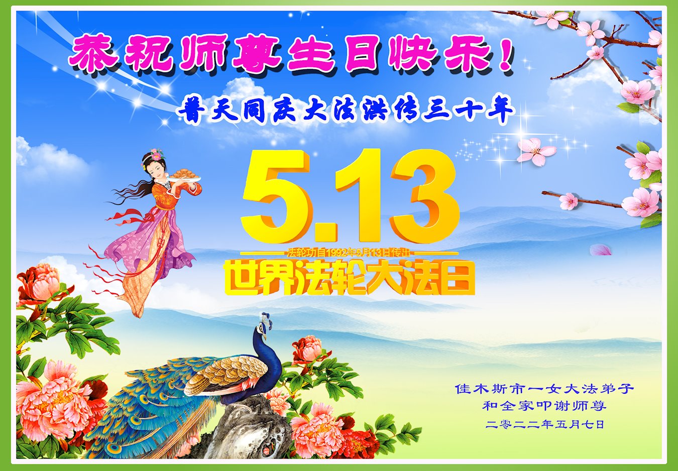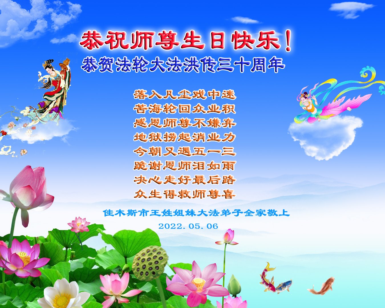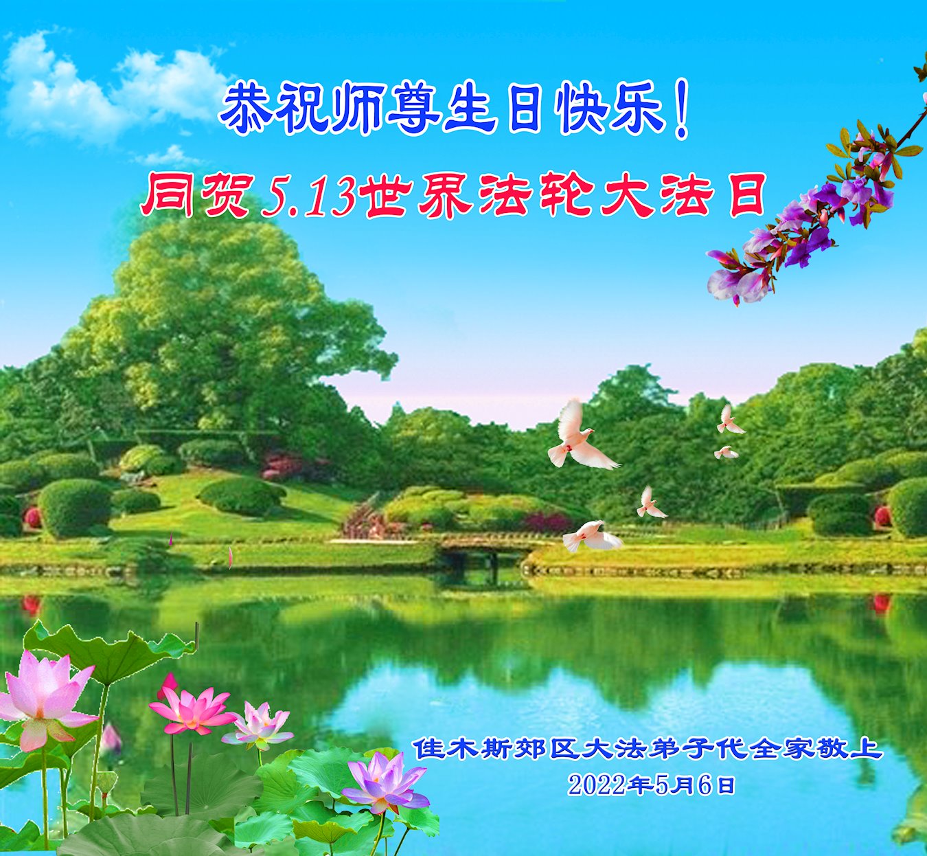 同庆世界法轮大法日,师尊传法三十周年,师尊辛苦了,感谢师尊对弟子每走一步的慈悲保护,谢师尊救度之恩,弟子学好法,修好自己多救众生, 佳木斯一老年女大法弟子敬上 2022年5月5日 黑龙江省佳木斯夫妻大法弟子恭祝慈悲伟大师尊生日快乐!