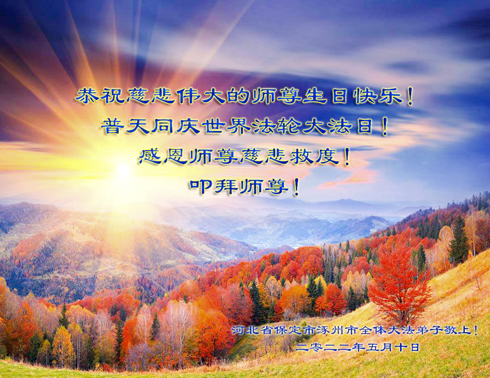 恭祝慈悲伟大的师尊生日快乐!恭贺世界法轮大法日!感恩师尊慈悲救度,叩拜师尊! 河北省涿州市全体法轮大法弟子敬上 2022年5月10日 河北省保定市九名大法弟子恭祝师父生日快乐!恭祝世界法轮大法日!