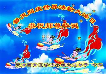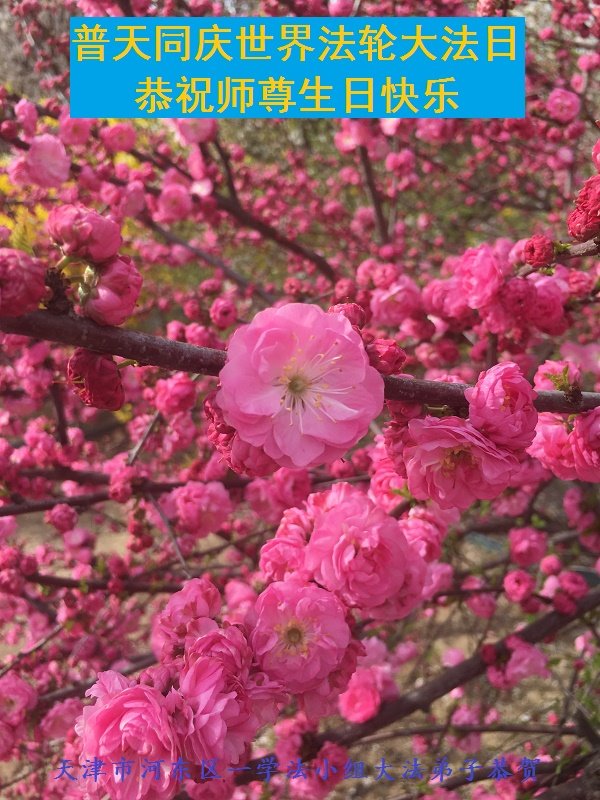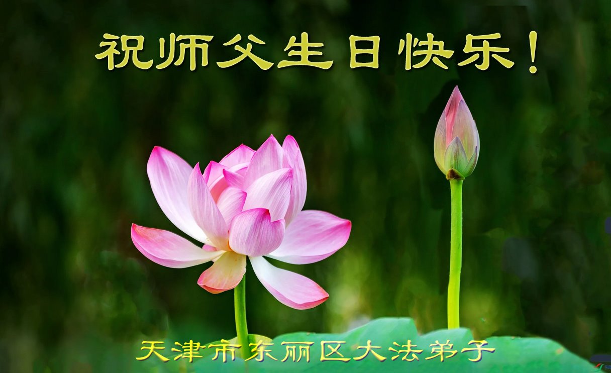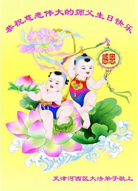 我们深感能成为“正法时期大法弟子”是我们的荣耀,是无上圣缘!师父我们会永远珍惜这份缘,紧跟师父不离航。叩谢师父在修炼路上的慈悲保护,我们要跳出人的观念,时时向内找,做好三件事,精進实修。 天津市津南区咸水沽镇大法弟子恭祝师父生日快乐!