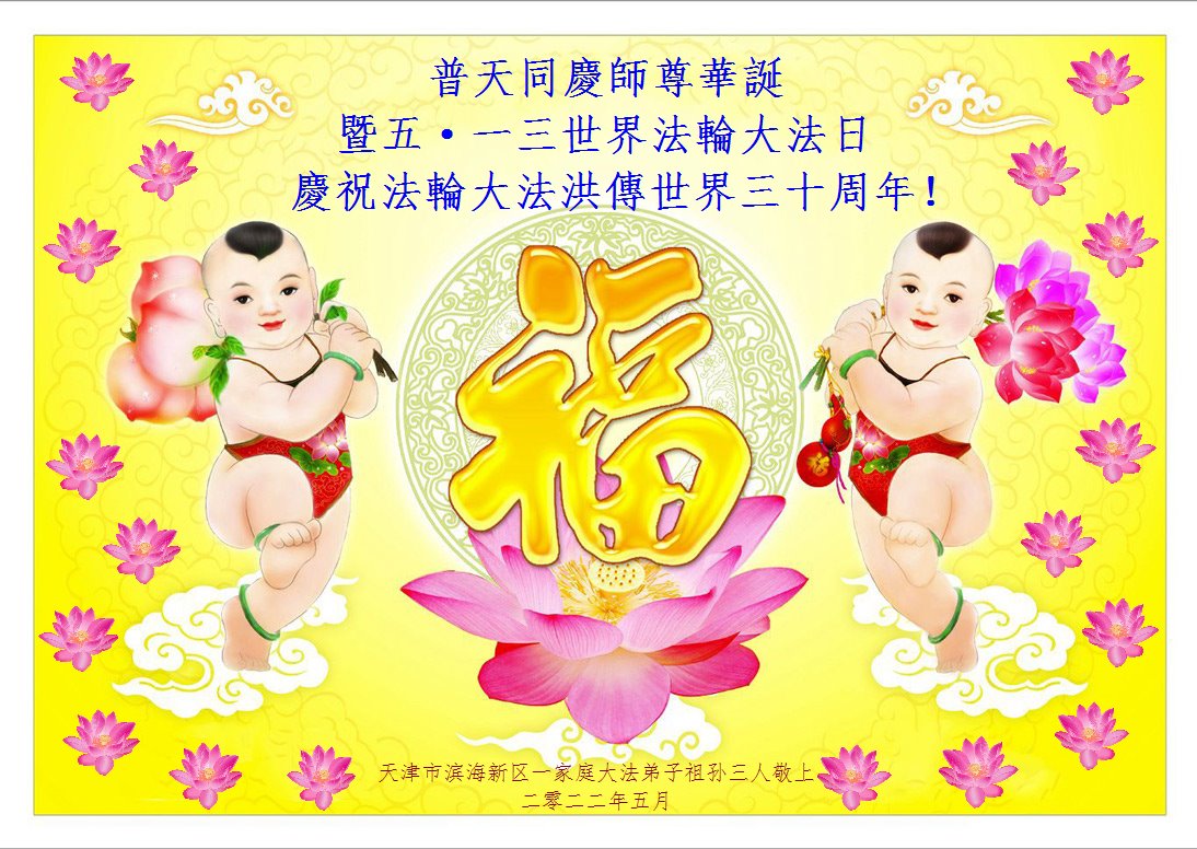 天津三人学法小组大法弟子恭祝慈悲伟大的师父生日快乐!今天,我们怀着无比崇敬的心情庆祝第二十三届“世界法轮大法日”、喜迎“法轮大法”洪传三十周年! 感恩师父的慈悲苦度!我们都是7.20之前得法的大法弟子,修炼中每个大法弟子都感受到了大法的伟大、师父的慈悲。今后,我们会更加坚定的走在助师正法的修炼路上。请师父放心。弟子们一定修好自己、做好三件事,圆满随师还。 天津市三人学法小组大法弟子叩首敬贺 2022年5月9日 天津市滨海新区一家庭大法弟子祖孙三人恭祝师尊华诞暨“五一三”世界法轮大法日!