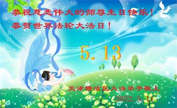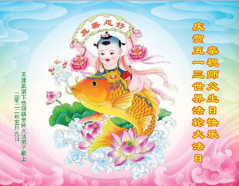 恭贺513世界法轮大法日!感恩师父一路保护,不辜负师父的期望。 天津市津南区咸水沽镇大法弟子恭祝师父生日快乐暨世界法轮大法日!