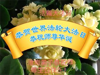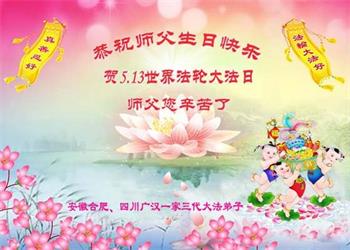 我们一家三代大法弟子祝贺法轮大法弘传世界三十周年暨第二十三届世界法轮大法日!恭祝师尊生日快乐!我们跟随师尊走过了风风雨雨,经历了很大的考验,无论多么千辛万苦,但我们从未动摇过对大法、对师尊的坚信。在辗转千百年后我们庆幸得到了这万古不遇的大法,懂得了来世的目地、生命的意义;知道了我们的历史使命。今后我们一定更加珍惜这来之不易的时光,学好法,坚定正念,修好自己,不被干扰,救度更多的众生。 安徽省马鞍山地区大法弟子恭祝师尊生日快乐!恭祝世界法轮大法日!