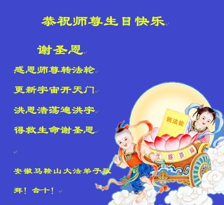 恭祝慈悲伟大的师尊生日快乐! 谢圣恩 感恩师尊转法轮 更新宇宙开天门 洪恩浩荡遍洪宇 得救生命谢圣恩 法轮大法好!真善忍好! 安徽马鞍山大法弟子敬拜!合十 安徽安庆全体大法弟子恭贺世界法轮大法日!