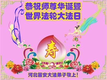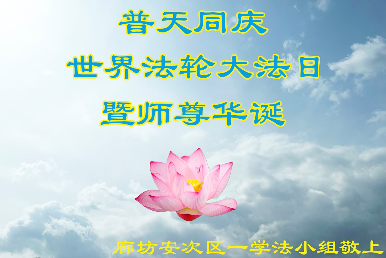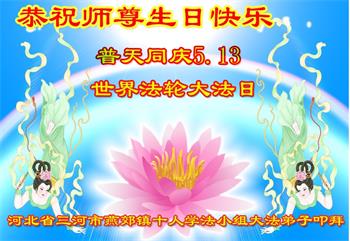 河北省廊坊市固安县大法弟子恭祝师尊生日快乐!普天同庆世界法轮大法日。 感恩师尊慈悲救度!弟子叩拜师恩! 河北省廊坊市三河市燕郊镇十人学法小组大法弟子恭祝慈悲伟大的师尊生日快乐!