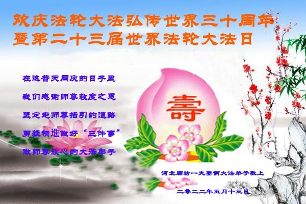 河北廊坊一夫妻大法弟子敬上 二零二二年五月十三日 河北廊坊一大法弟子恭祝慈悲伟大的师尊生日快乐!普天欢庆世界法轮大法日!